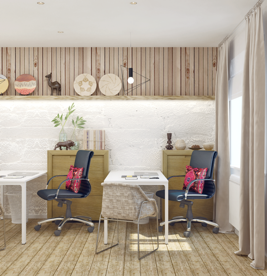Офис находится на первом этаже жилого дома, окна выходят во двор, из-за чего когда-то жилые комнаты были мрачными и тесными. Помещение полностью преобразилось благодаря грамотной функциональной реконструкции, использованию натуральных материалов, лаконичных форм и светлой палитры.