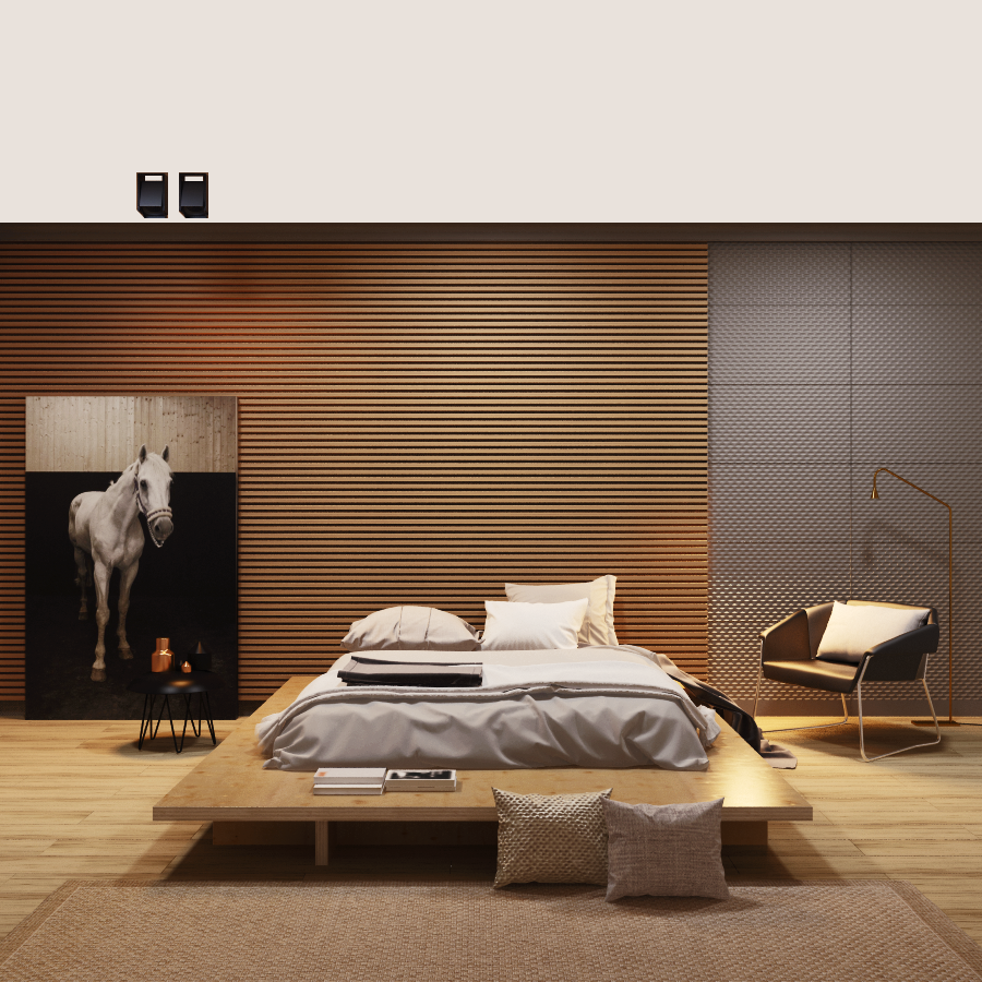 Стиль и функциональность сочетаются в проекте, геометрические формы и графические элементы цепляют взгляд и запоминаются. Спальня выполнена в более мягкой гамме.